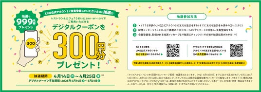 KITTE博多LINE公式アカウントで会員登録していただいた方に、KITTE博多レストラン&カフェ「うまいと」(B1・9F・10F)の店舗で利用可能なデジタルクーポン300円分が合計999名様に当たる「抽選メッセージ」を配信いたします。この機会に、是非、LINE公式アカウントの友だち追加および会員登録を!