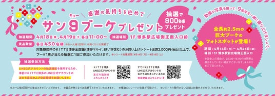 対象期間中のKITTE博多全店舗(博多マルイ、8F、11F含む)のお買い上げレシート合算2,000円(税込)以上で、ブーケ1束が当たる抽選に1回ご参加いただけます。