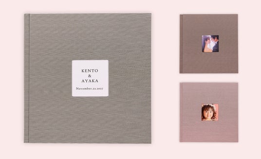 背表紙の色は表紙写真に合わせて選べる全6色。表紙の名入れはさりげなくおしゃれに。
