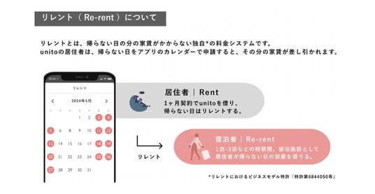 Unitoのビジネスモデルは、特許取得済みの「リレント」を中心に、プロパティマネジメント、プラットフォーム運営、ブランド開発の3本柱で構成されています。「リレント」は、実際に住んだ日数分のみ家賃が発生するシステムであり、従来の賃貸契約とは異なり、入居者が不在時には宿泊施設として活用することで家賃負担を軽減できる画期的な仕組みです。この独自モデルにより、物件オーナーには稼働率の向上を、利用者にはコスト最適化をもたらし、新たな暮らし方の選択肢を提供しています。
