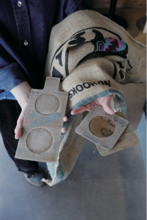 サステナビリティも空間づくりの重要なテーマです。リサイクルプラスチックを使用したテーブルや、焙煎後に廃棄される生豆麻袋を再利用したオリジナル「Re:Jute」シリーズ (コースターやコーヒーフライトボード)など、素材の循環を意識したプロダクトが並びます。さらに、店内の家具はFLANGE PLYWOODによる椅子を取り入れています。家具製作の過程で生まれる端材や保護材、余った塗料など、これまで捨てられてきた素材を活かして、偶発的な魅力をそのままに一点一点直感的に仕上げられています。コーヒーを囲む空間そのものが、創造性とサステナビリティを体現する表現のひとつとなっています。
