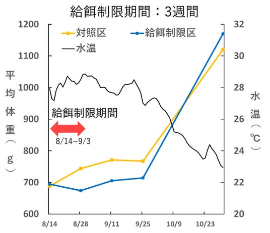 2023年8月~10月の検証では、3週間の給餌制限を行い試験スタート時から終了時までの3か月間において給餌量は18%削減、増肉係数※は32%低くなりました。(図1.)これは、魚体重を1kg増やすために必要な飼料の量が32%削減できていることを示しており、非常に大きなコストメリットを得ることができています。また、試験区の魚体重も対照区(通常給餌区)を追い越すなど増体面でも効果が確認できました(図2.)。加えて、給餌制限を行った生簀の方が試験期間中の斃死尾数が少ない等、この現象を応用することで養殖経営における飼料コストの削減、海水温上昇時の斃死尾数低減に寄与することが期待されます。※増肉係数とは:魚の体重を1kg増やすために必要な飼料の量