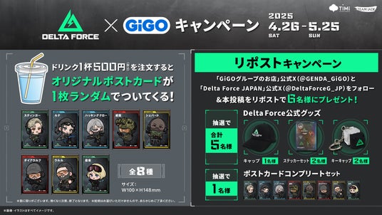 株式会社GENDA GiGO Entertainment(本社:東京都港区 代表取締役社長:二宮 一浩 以下「当社」)は2025年4月26日(土)より、GiGOグループのお店におきまして、チーム戦術に特化した無料タクティカルシューター『Delta Force』(デルタフォース)とのコラボキャンペーンを開催いたします。