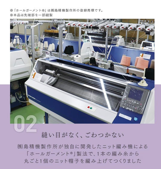 「ホールガーメント(R)」製法で縫い目がなくごわつきがない着心地。締め付け感も少なく、長時間ストレスなくかぶることができます。