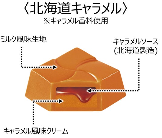 ミルク風味生地の中に北海道製造のキャラメルソースとキャラメル風味クリームを入れました。ミルキーでとろける美味しさです。