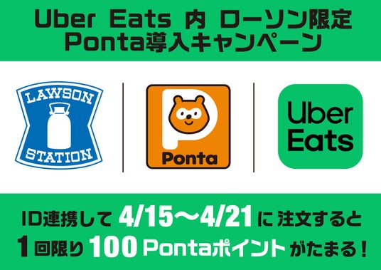 また、サービス開始を記念し、4月15日(火)から4月21日(月)にUber Eats 内 ローソン限定 Ponta導入キャンペーンを開催します。Uber Eatsのローソン店舗ページでPonta会員IDを入力の上、商品を購入された方に1度限りもれなく100Pontaポイントをプレゼントします。