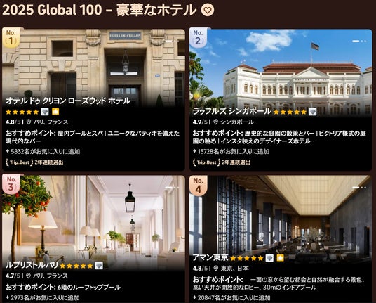 「2025 Trip.BEST Global 100」の豪華ホテルランキングでは、フランスの「オテル・ドゥ・クリヨン ア・ローズウッド・ホテル」が1位に輝きました。2位は、シンガポールの「ラッフルズ」、3位はフランスの「ル・ブリストル・パリ エッカー・コレクション・ホテル」という結果になりました。4位は、東京の「アマン東京」、5位はフランスの「ラ・リザーブ・パリ ホテル&スパ」がランクインしました。
