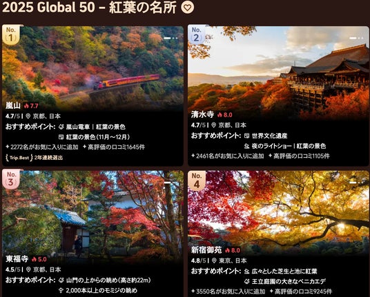 今年から観光スポットのカテゴリーに「春旅におすすめ」、「水遊び」、「紅葉のスポット」の3つのテーマが加わりました。「春先におすすめ」ランキングでは1位に「上野恩賜公園」、2位「新宿御苑」、3位「大阪城公園」と日本がTOP3を独占。「水遊び」は人気のウォーターパークやビーチを紹介し、「紅葉スポット」では世界各地の絶景紅葉スポットを紹介しています。紅葉スポットランキングでは、1位に「嵐山」、2位「清水寺」、3位「東福寺」という結果となり、定番スポットが上位にランクインしました。