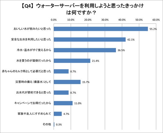 その他、「お水を買うのが面倒だったから」が21.4%、「災害時の備えとして」が15.7%と高い割合となりました。