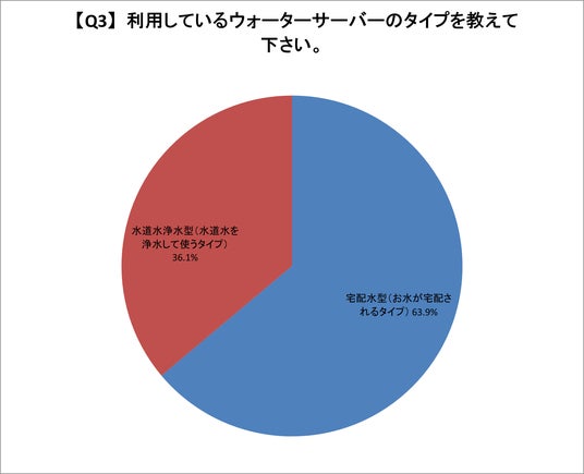 利用しているウォーターサーバーのタイプでは、63.9%が宅配水型を利用しており、水道水浄水型は36.1%でした。