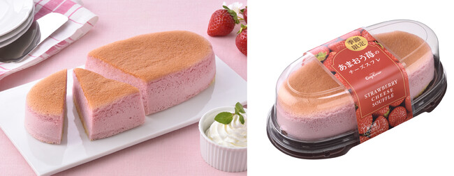 “しっとり、ふわシュワッ”の食感で人気の「チーズスフレ」に、あまおう苺の味わいをプラスしました。口のなかで、ふわシュワッとほどけて広がる、あまおう苺の濃厚な甘み&華やかな香りをお楽しみください。
