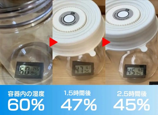 最初、容器内の湿度は60%でしたが、【Mini Polpo】で蓋をすると容器内の1.5時間後の湿度は47%に。実に13%も低下しています。その後2.5時間後には、容器内の湿度は45%にまで低下しました。