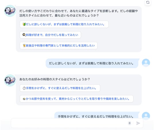 レシピ検索にも対応しているので、冷蔵庫の中にある材料を入力すればだしを使ったレシピをチャットボットがご提案することも可能。ぜひ『だしAI』を生活の中に取り入れていただけると嬉しいです。