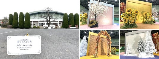 亜細亜学園学友会主催のもと、季節の四季を表現したフォトスポットを制作し、体育館内に設置。周辺には季節ごとの行事写真掲出やディスプレイアイテムが設置され、卒業生がこれまでのキャンパスライフを振り返りながら撮影が楽しめる企画を実施。学生たちのアイデアをカタチにしました。