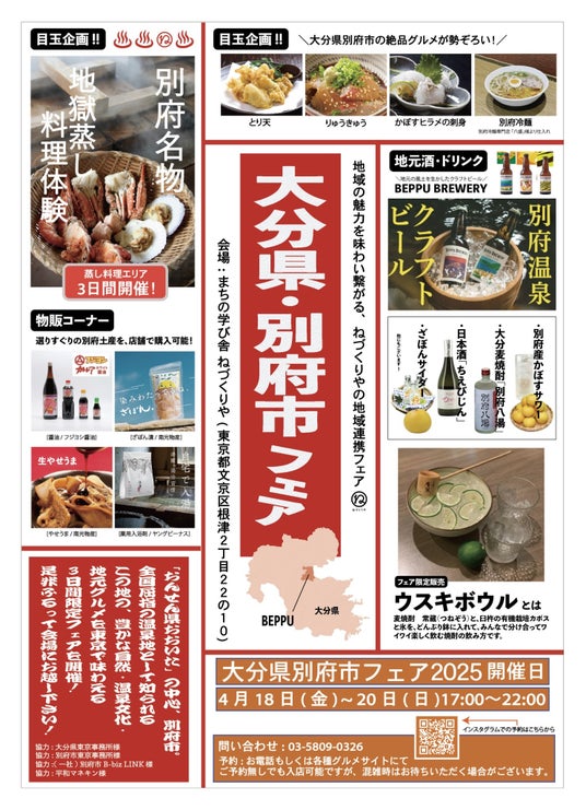 本イベントは、文京区根津の飲食スペース「ねづくりや」が、大分県東京事務所および別府市東京事務所と連携して実施するもので、別府ならではの名物「地獄蒸し料理」をはじめ、「かぼすヒラメの刺身」「別府冷麺」「りゅうきゅう」など、別府の郷土料理が一堂に会します。また、「Beppu Breweryのクラフトビール」「ざぼんサイダー」など、地元の風土が香るドリンクや、「薬用入浴剤 湯躍」「カボス醤油」といった特産品の販売も行われます。