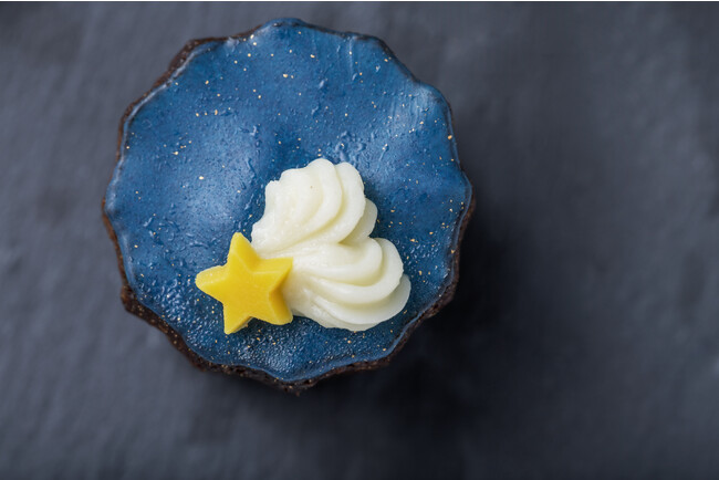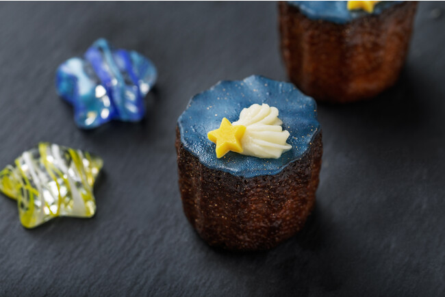 天面の目を引くデコレーションは、七夕の夜空をイメージしたチョコレート。流れ星をモチーフにした黄色い星型のチョコレートと練乳入りのチョコレートクリームが、カヌレのカリッとした食感にアクセントを加えます。七夕の星空に願いを込めたこのカヌレは、見た目にも初夏を楽しめること請け合いです。