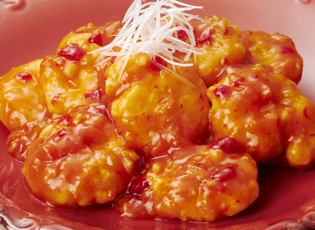 海老チリソースの主役は海老。その海老を引き立たせるためにこだわったのが「衣」です。衣は厚いと海老の食感が分かりづらくなります。無いと海老とソースの一体感が感じられません。海老のぷりぷりっとしたベストな食感を生み出すため、粉専門メーカーと協力して何度も試作を繰り返し、薄付きながらも海老から離れない新しい衣をこの海老チリソースのために開発しました。購入されたお客様から「海老がぷりぷり」「海老が美味しい」と好評です。
