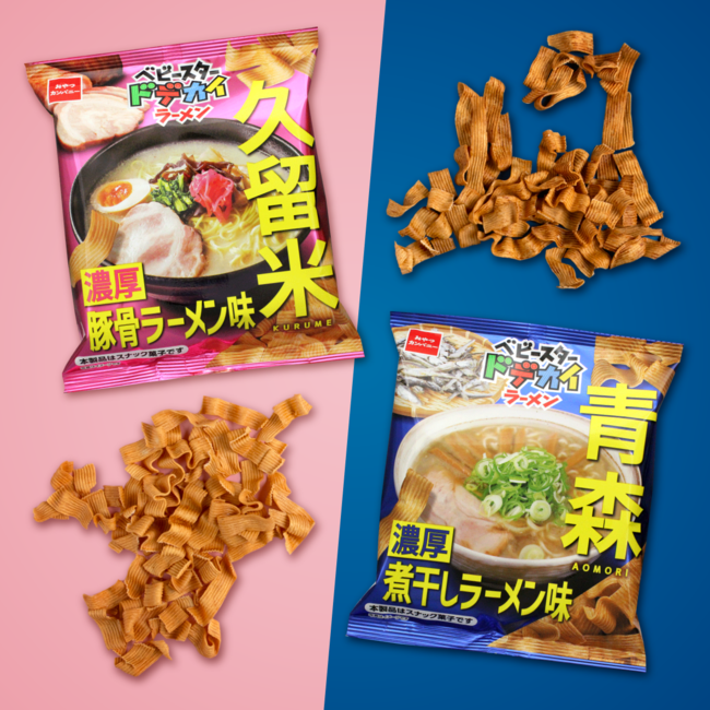株式会社おやつカンパニー(本社所在地:三重県津市 代表取締役社長:手島文雄)は、麺から創り続けて60余年のベビースターで、青森・久留米のご当地ラーメンを表現した『ベビースタードデカイラーメン(青森濃厚煮干しラーメン味/久留米濃厚豚骨ラーメン味)』の2品を、2023年2月20日(月)より全国にて発売します。食べ応え抜群な幅広麺のベビースタードデカイラーメンを濃厚な味わいに仕上げ、地元で愛されている青森・久留米のご当地ラーメンの味わいをご自宅にいながら手軽にお楽しみいただける商品になりました。