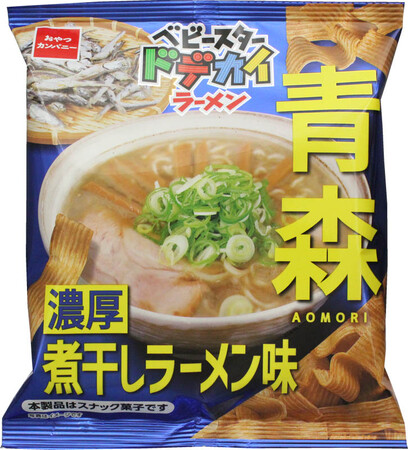 「ベビースタードデカイラーメン(青森濃厚煮干しラーメン味)」は、煮干しを使ったダシに醤油ダレをあわせた濃厚で塩味がきいたスープが特徴の青森で愛されているご当地ラーメンを表現。ガツンと濃厚な煮干しの旨みに醤油のコクをきかせ、クセになる味わいに仕上げました。