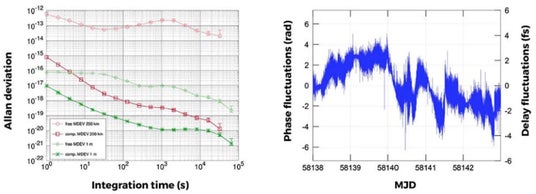 680 kmの光ファイバーリンクを介した伝送後のエンドツーエンド位相揺らぎ