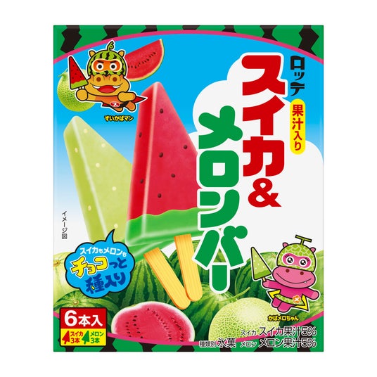 チョコ種入りで、まるでスイカとメロンのような形と食感が楽しい、家族向けマルチアイスバーです。
