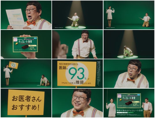 「今年もあかんかった、健康診断」と嘆くチャンカワイさん。そこへ白衣の女性が登場し、「健康を考えるならチョコレート効果がいいですよ」と提案します。驚きの表情を浮かべるチャンカワイさんは、「チョコで健康を考えられるんですか!?」と半信半疑の様子。しかし、すぐに「いや、待て。そんなうまい話あるわけないやろ~!」と疑念を隠せません。白衣の女性は「毎日の健康管理を重視する医師の93%がチョコレート効果を推奨しているんです」と説明します。「推奨」という言葉に戸惑いつつも、「つまり、お医者さんおすすめ」という言葉に納得した表情で「はい、食べます」と答えるチャンカワイさん。最後に「健康を考えるチョコ、明治チョコレート効果」というナレーションが流れ、CMは締めくくられます。