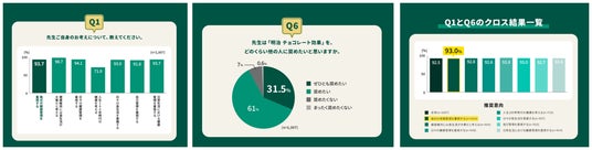 家庭の医学リサーチは、明治の「チョコレート効果」について、1,007人の医師を対象とした調査を実施しました。調査の結果、製品の認知度は高く、試食後の評価では「品質が良い」「信頼できる」「健康維持に良い」という回答がいずれも90%を超えました。また、「糖質を気にせず食べられる」や「食べ続けたい」という項目についても、80%以上の回答が得られました。