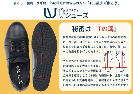 骨格のバランスが整う理想の立ち方「WTの立ち方」を履くだけで実現するシューズ。靴底にある特殊なTの溝が「WTの立ち方」の効果をもたらします。WTシューズを履くことで骨格のバランスが整い、関節や筋肉への負担が軽減、柔軟性や可動域、安定性の向上が見込めます。