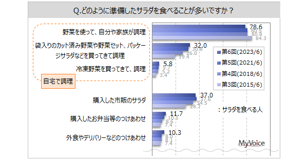 サラダを食べる人に、どのように準備したサラダを食べることが多いかを聞いたところ(複数回答)、「野菜を使って、自分や家族が調理」が78.6%となっています。「袋入りのカット済み野菜や野菜セット、パッケージサラダなどを買ってきて調理」が32.0%、過去調査と比べて増加傾向です。「購入した市販のサラダ」は37.0%となっています。