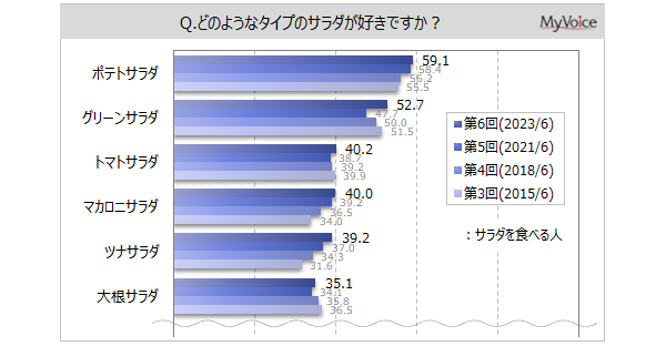 ■好きなサラダのタイプは「ポテトサラダ」「グリーンサラダ」がサラダを食べる人の5~6割、「トマトサラダ」「マカロニサラダ」「ツナサラダ」が4割前後