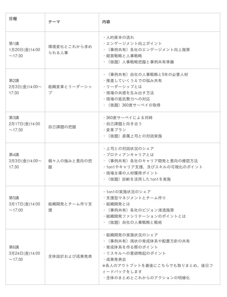 今回はご好評につき、第二期生を募集し、全6回に渡って、エンゲージメントが高い組織を作り、一人ひとりの「人的資本が最大化」されるような戦略を推進できる人事の育成をテーマに掲げます。ぜひご参加ください。