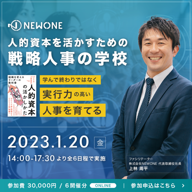 エンゲージメント向上を軸とした組織開発・人材育成コンサルティング支援を行う株式会社NEWONE(本社:東京都千代田区 代表取締役:上林周平、https://new-one.co.jp/ 以下、NEWONE)は、ご好評につき、人的資本を活かすための戦略人事のための学校の第二期を、2023年1月20日(金)より開催いたします。