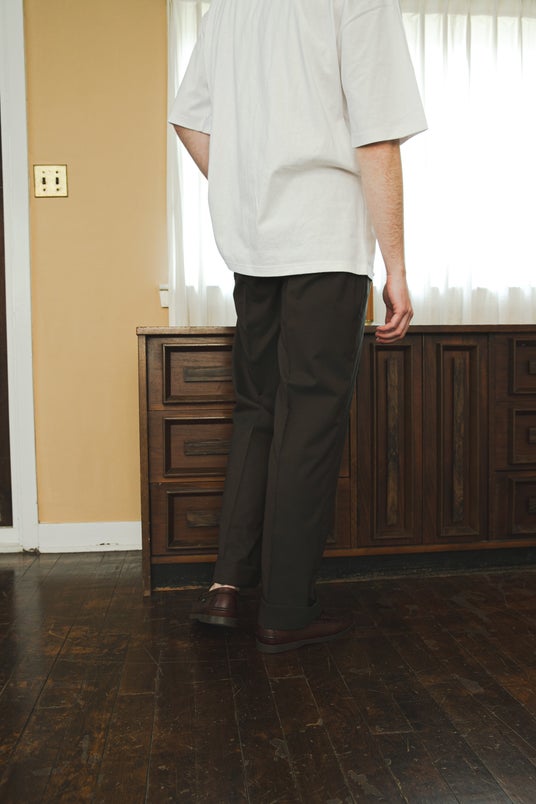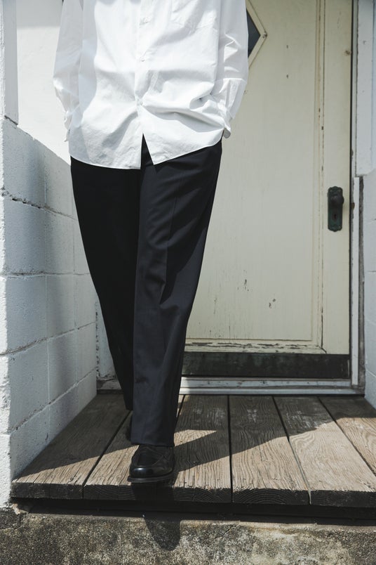 インラインには無い2インタックの仕様で、裾巾も広めに調整し、リラックスしたシルエットに。裾はフラシ仕上げですので、お好みのレングスに仕上げてご着用ください。