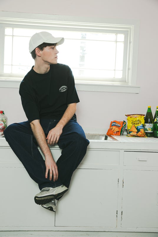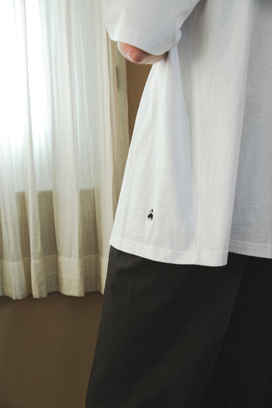 前回の10番単糸のヘビーウェイトな生地感から、16番単糸のミディアムウェイトなコットン天竺生地に変更。1枚での着用でも透け感が出にくい、程よい肉感の生地の為、インナー、1枚着の両面で活躍します。裾にブランドのアイコンであるゴールデン フリースのワンポイント刺繍が施されています。