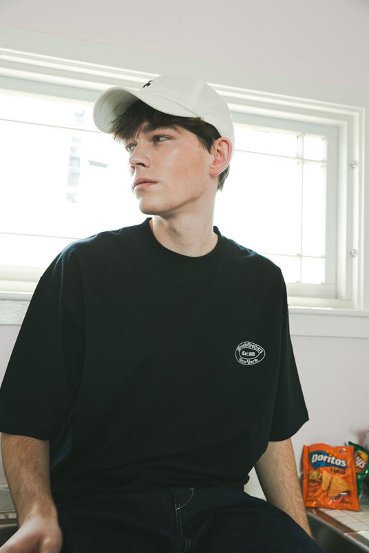前回の10番単糸のヘビーウェイトな生地感から、16番単糸のミディアムウェイトなコットン天竺生地に変更。1枚での着用でも透け感が出にくい、程よい肉感の生地の為、インナー、1枚着の両面で活躍します。左胸部分にはブランドサイズ表記に用いられるオーバルデザインのプリントが施され、1枚で様になるUR別注仕様のデザインです。