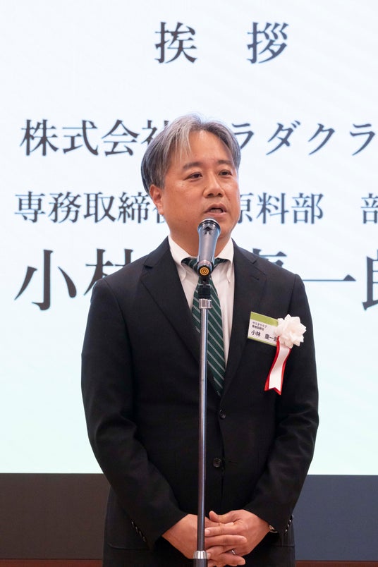 また、原料調達の責任者を務める専務の小林は今回新たに設けた「功労賞」の表彰について、「『功労賞』は、原料の調達が厳しい中、契約数量以上にご納品いただいた生産者の皆様に感謝の意を込めて贈るものです。非常に厳しい環境下においても、私たちの取り組みにご理解とご協力をいただけたことに、心より御礼申し上げます。」と話しました。