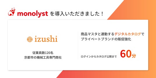 monolyst株式会社(本社:東京都渋谷区、代表取締役:伊関 洋介)が運営する転記レス商品情報管理システム「monolyst(モノリスト)」は、 機械工具専門商社の株式会社IZUSHI(本社:京都府京都市、代表取締役社長:出石 篤)に導入、2025年4月より本格運用が開始されました。
