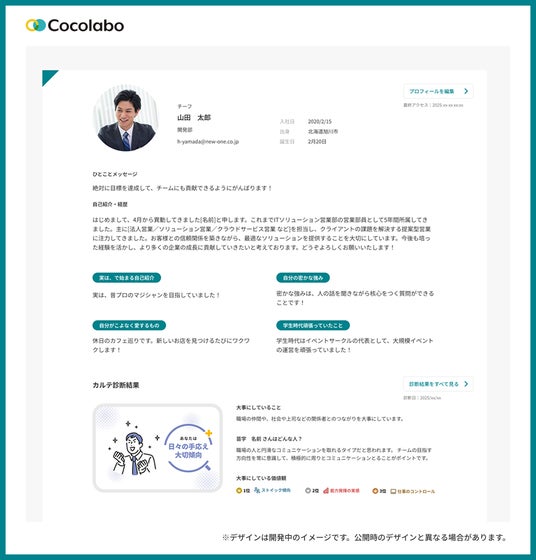 今回のアップデートによって、Cocolaboでの活動内容がメンバーごとにまとめられた「メンバーページ」を公開いたします。本ページでは、自己紹介だけでなく、Cocolaboカルテ結果や担当アクションなどを閲覧できる予定です。