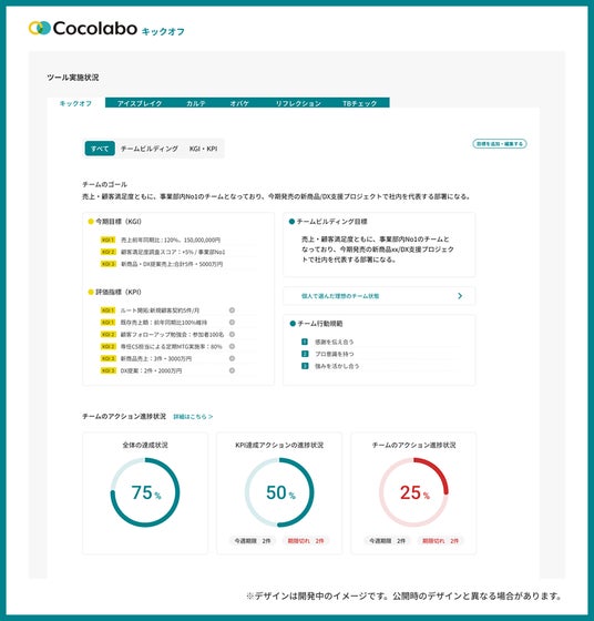 今回のアップデートでは、チームビルディングの状況・状態を調べる「チームビルディングチェック」や、チームの目標設定アクションプランの管理やキックオフMTGをサポートする「キックオフ」のアップデートを計画に含めており、これまで以上にわかりやすく、チームマネジメントに使いやすい機能が追加されます。