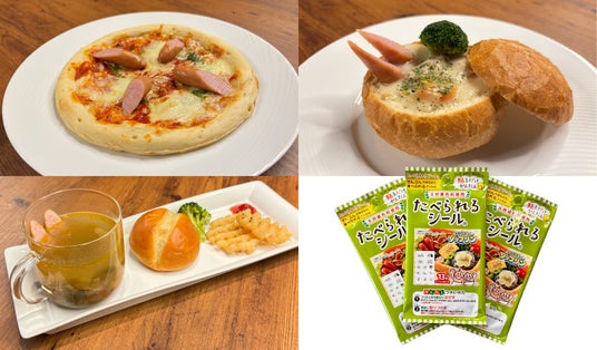 香薫(R)あらびきポークウインナーを使った限定メニュー注文 1 品ごとに、ソップリンのたべられるシール 1 袋プレゼント!頼んだお料理に貼ってみてもよし、おうちでお弁当などに使っても楽しいよ。
