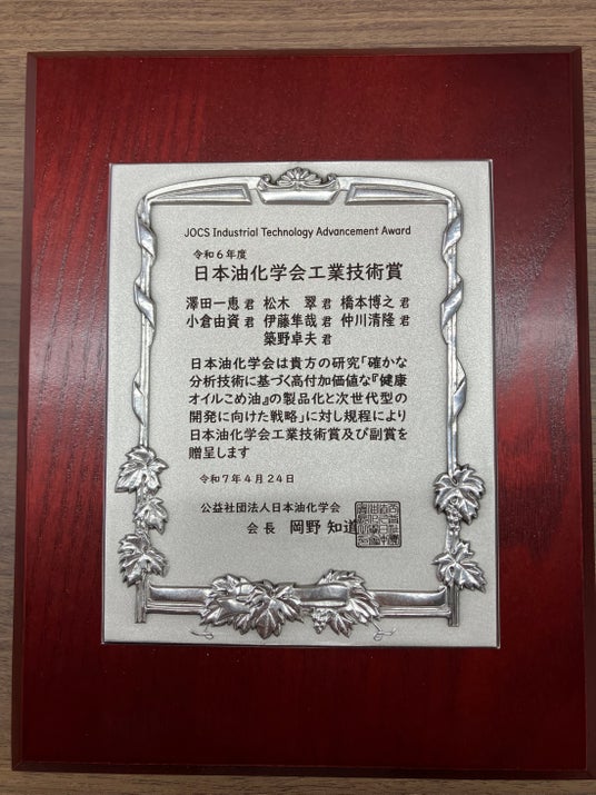 日本油化学会は、油脂・脂質、界面活性剤及び関連物質に関する科学と技術の進歩を図り、産業の発展、生活と健康の向上に寄与することを目的とした学術団体で、産学が一体となり、いち早くサステナビリティと向き合ってきた学術領域のひとつです。同学会の工業技術賞は、油化学工業において顕著な技術的成果をあげた研究又は発明に授与するものです。日本油化学会:https://jocs.jp/