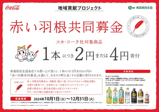 このプロジェクトは、青森県内の地域福祉推進に役立てることを目的に、2024年10月1日(火)~ 12月31日(火)の3ヵ月間、青森県民生協全12店舗において「コカ・コーラ社対象商品」を購入いただくと1本につき2円または4円が赤い羽根共同募金に寄付されるもので、期間中に売り上げた本数は91,761本、寄付金額は238,832円となりました。なお、このプロジェクトは2018年から実施しており、今回を含めた寄付金の合計は880,450円となりました。