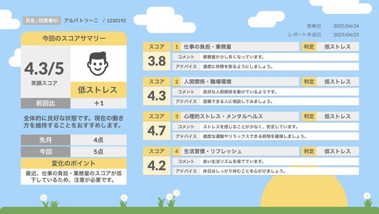 「業務負担」「人間関係」「ストレス」「生活習慣」の4項目をスコア化し、変化に応じて個別対応を行うことで、“見えない離職予備軍”への早期フォローを実現。離職率は8%未満に抑えられており、安心して働き続けられる環境づくりに寄与しています。