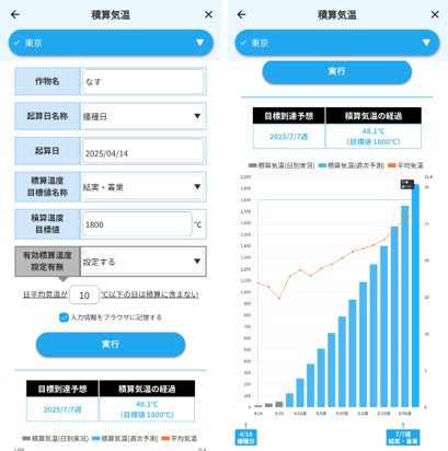 作物名、起算日名称、積算温度目標値等を設定することにより、起算日から昨日までの積算気温の経過に加えて、設定した積算気温目標値の“到達予想週”が自動でグラフ化されて表示されます。biz tenkiで登録可能な最大5地点で、それぞれ積算気温の算出が可能です。