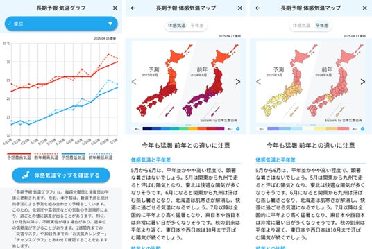 また、6ヶ月先までの月次の体感気温マップでは予報している期間の体感気温と平年差、前年比較に関するコメントを閲覧できます。この予報コメントは日本気象協会のこれまでの天気予報を活用した企業向け需要予測コンサルティングで培った独自の知見から作成しています。