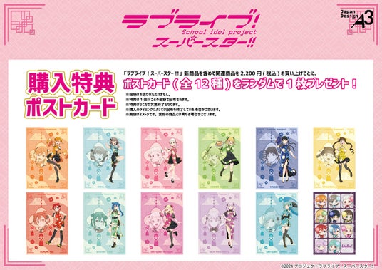 『ラブライブ!スーパースター!!』の新作グッズを含む関連商品を2,200円(税込)お買い上げごとに、ポストカード(全12種)をランダムで1枚プレゼント。