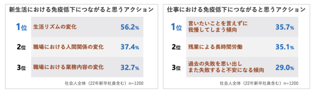 社会人(22年新卒社員含む。n=1,200)に「新生活や仕事において、免疫低下につながると思う行動や傾向」を尋ねたところ、新生活においては、1位「生活リズムの変化」、2位「職場における人間関係の変化」、3位「職場における業務内容の変化」という結果になりました。仕事においては、1位「言いたいことを言えず我慢してしまう傾向」、2位「残業による長時間労働」、3位「過去の失敗を思い出し、また失敗すると不安になる傾向」という結果になりました。