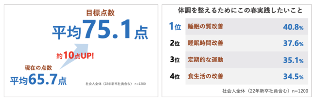 また、「新生活を迎えるにあたって目指す体調の点数」を尋ねると、現状よりも約10点アップの平均75.1点という結果に。そして、「体調を整えるためにこの春始めたいこと」を尋ねると、「睡眠の改善」をはじめ、「運動の改善」「食生活の改善」が上位で、「枕を新調する」や「免疫を意識した食事をとる」といった回答も見られました。