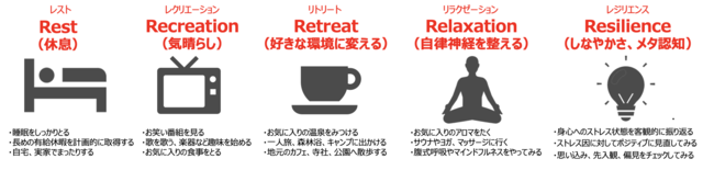 一般的に、免疫の低下を回避する方法として睡眠・食事・運動などがあげられますが、免疫の低下につながるストレスを緩和する「4R」も同じくらい重要です。4Rは1. Rest(休息)、2. Recreation(気晴らし)、3. Retreat(好きな環境に変える)、4. Relaxation(自律神経を整える)の“R”の頭文字をとったものです。さらに、コロナ禍で「新たなR」として注目が集まっているのは5. Resilience(しなやかさ、メタ認知など)です。こういった、行動を日々心がけることでストレス負荷を軽減させていくことが可能です。