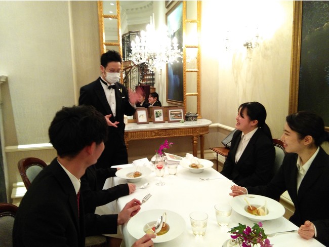 数名ずつのグループに分かれ、入社式の会場をあとにして向かうのは都内にあるひらまつのレストラン。そこで、まずは自分自身が「ゲスト」となり、ひらまつのホスピタリティーとは何かを体験します。「食の可能性を広げ、心ゆさぶる“時”を提供する」というひらまつのミッションを胸に、これから「期待値を超える感動の食体験」を共に創り上げていく新しい仲間へ、先輩たちからのサプライズプレゼントです。